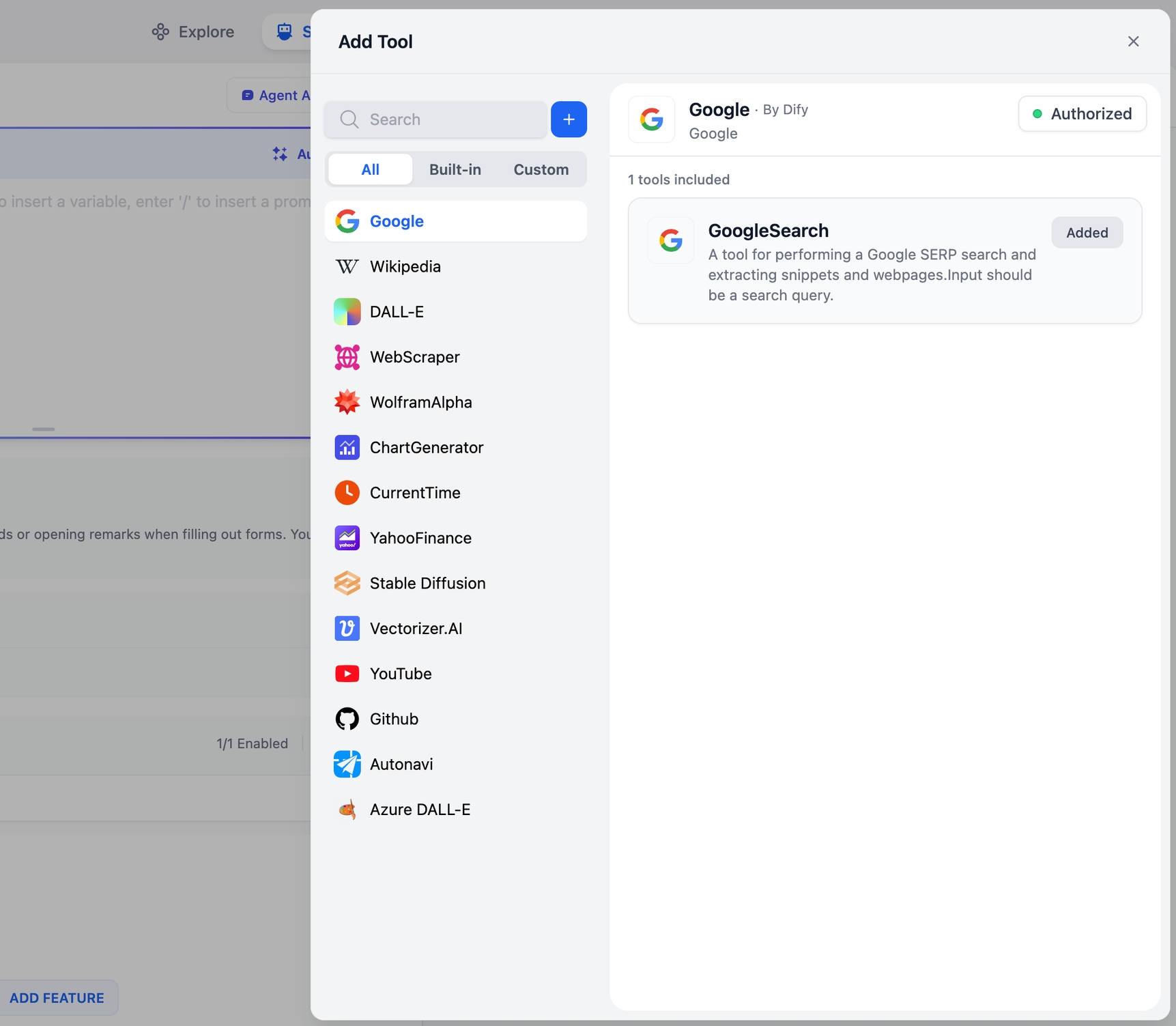 Google, là một công cụ bên thứ ba, sử dụng API được cung cấp bởi SerpApi, yêu cầu một API Key để sử dụng. Điều này có nghĩa là công cụ này cần thông tin xác thực để sử dụng. Đối với các công cụ như wikipedia, không cần điền vào trường thông tin xác thực, bạn có thể tham khảo: api/core/tools/provider/builtin/wikipedia/wikipedia.yaml.